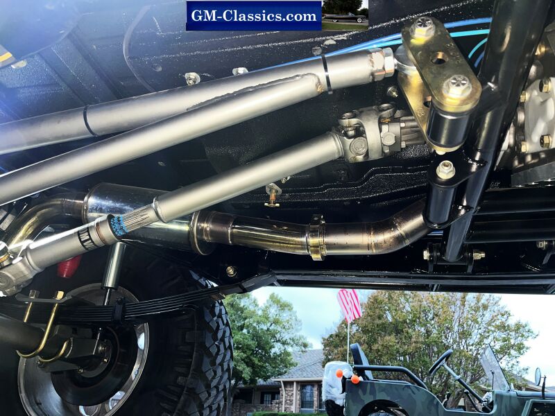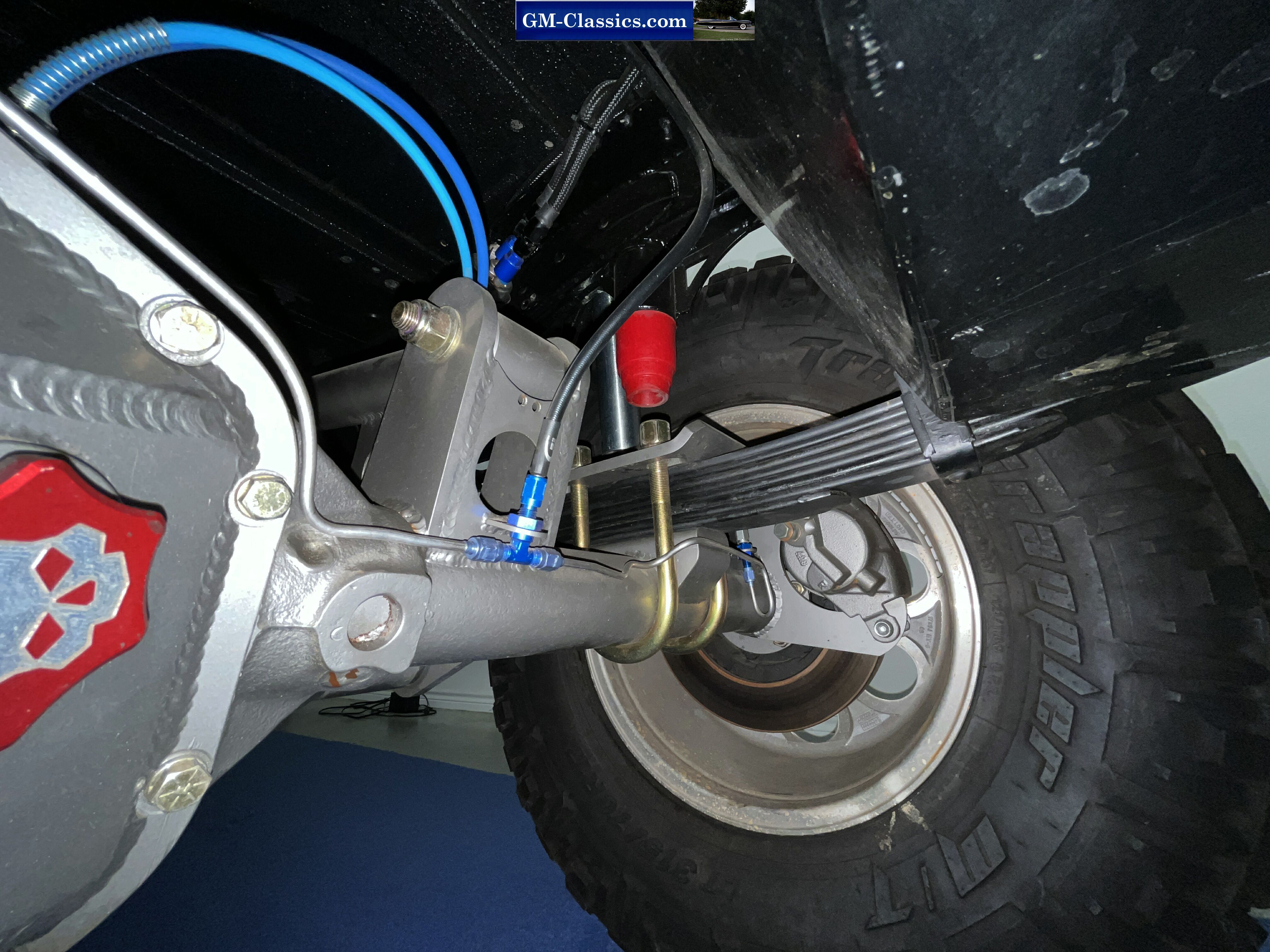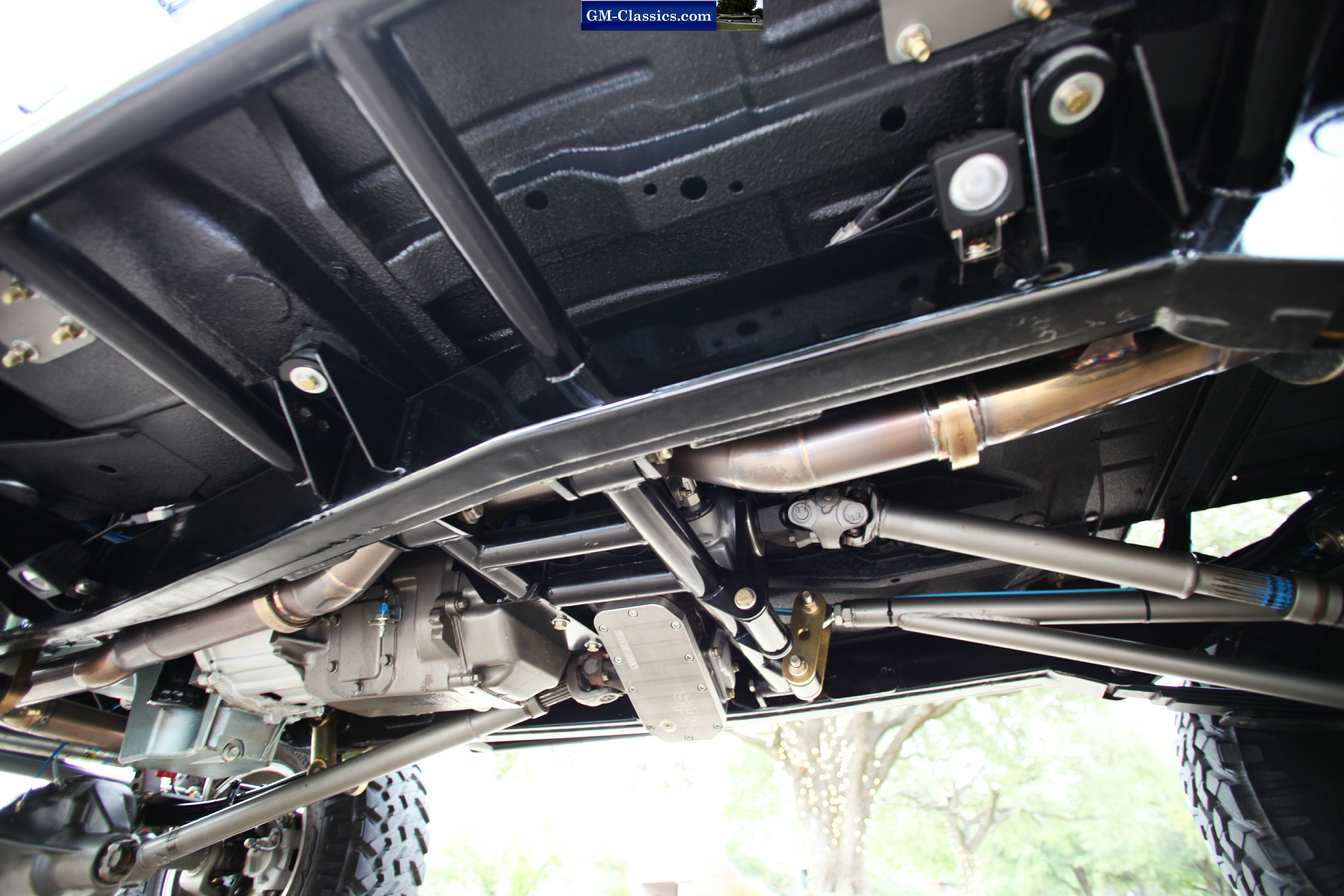 Torque arm and Tom woods driveshaft seen along with full stainless 3" exhaust, GM Z71 4 wheel disk brakes