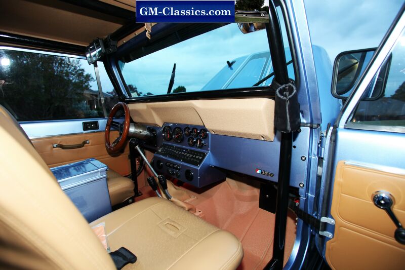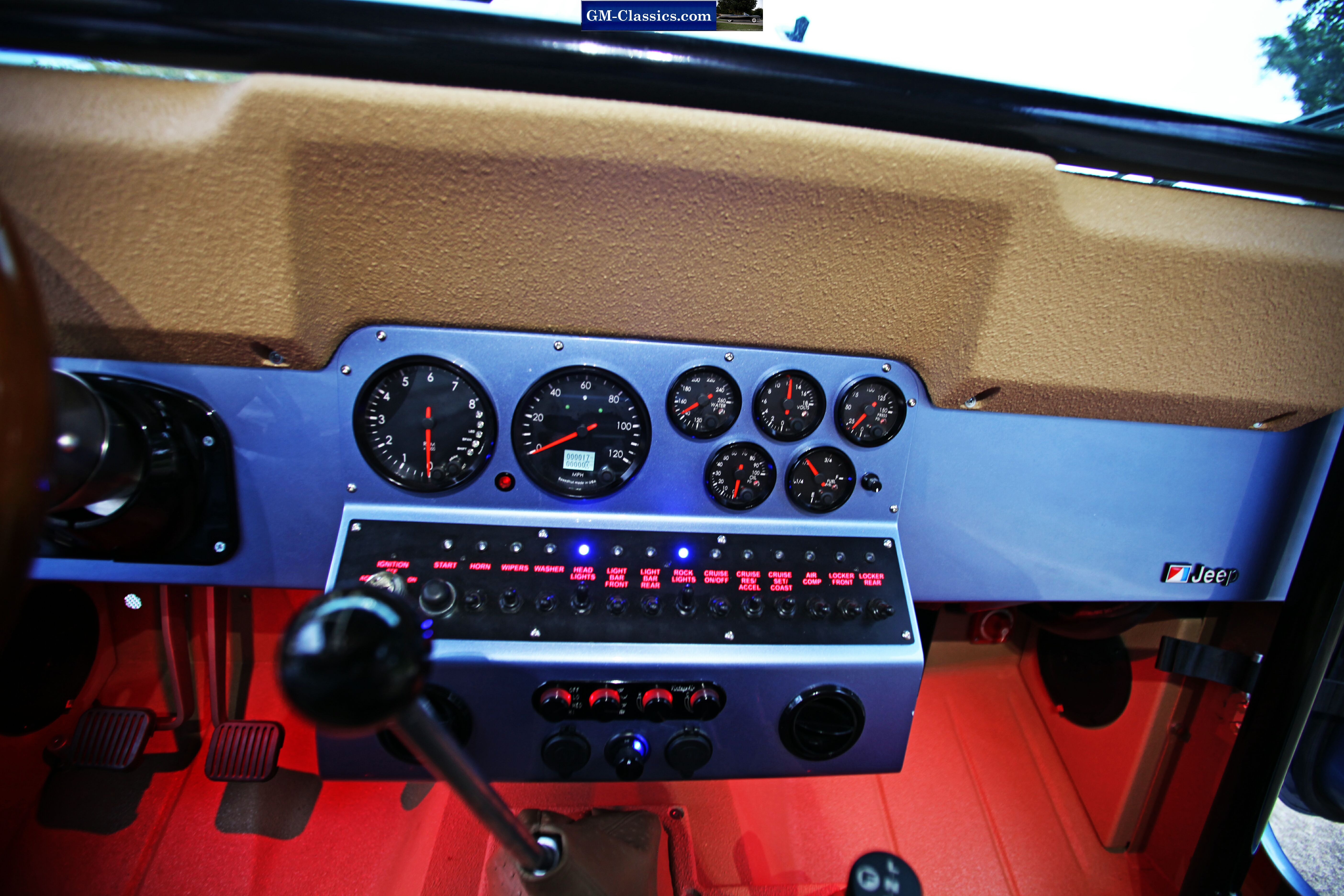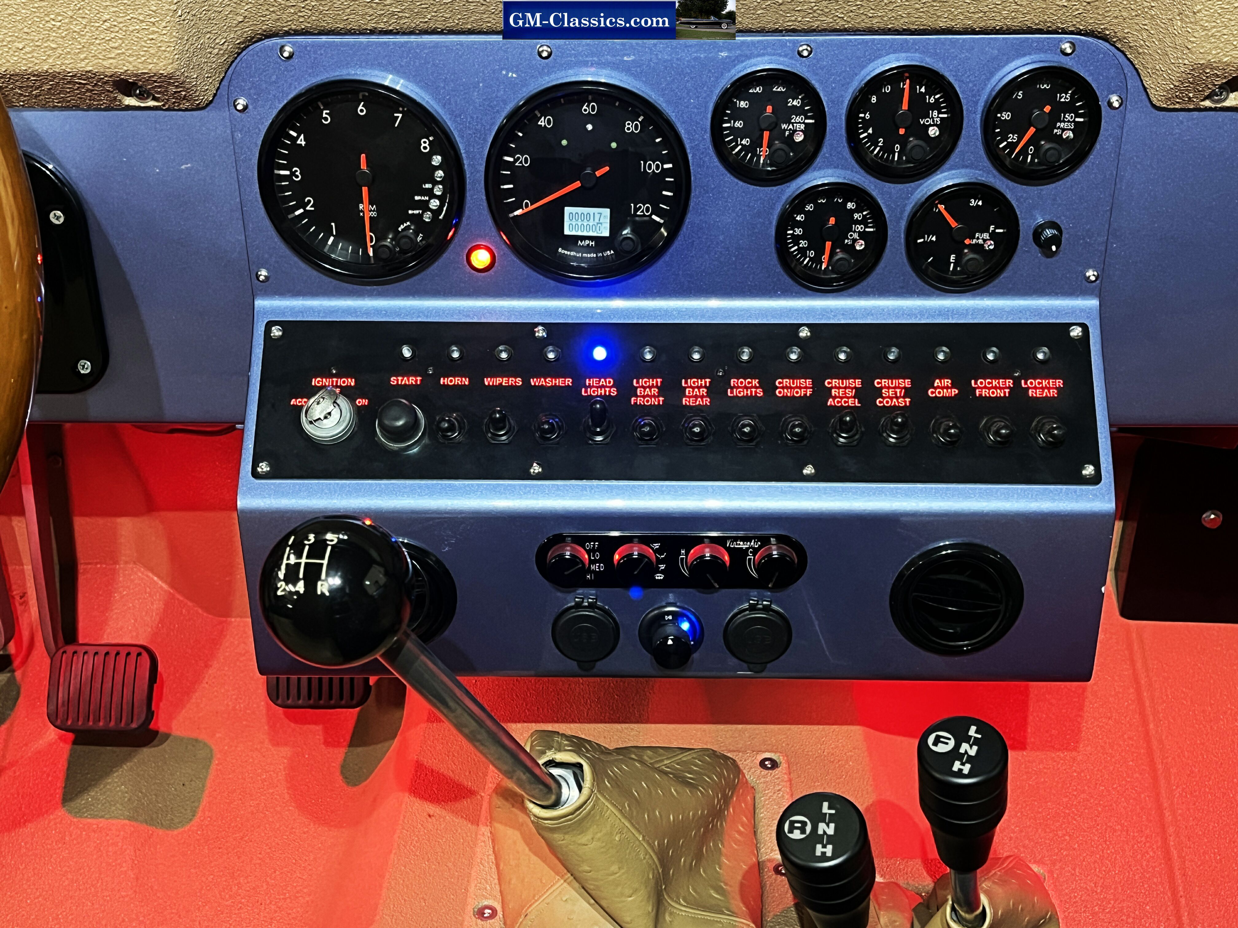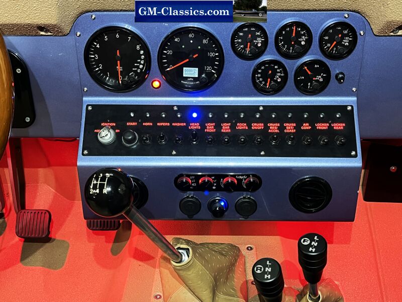 Now when you get to the interior, even the average guy who misses a lot of the frame and structural touches will see just how over the top this Jeep is. Its not a luxo barbie jeep by any means, all was done with heavy duty in mind with all color keyed Hard Line/LineX floors, this carries to the underside of the body too and key wear areas ... But it has one of the nicest custom setups with excellent working vintage air and heat as I have ever seen in any CJ.. and its weight/balance and its general mix of street/offroad suspension make it street drive excellent. In other words, you can turn a corner in this and it wont woller over on you like a crawler build, but it still can fly over dips, bumps and articulate pretty darn good. That is why I say the suspension is general use, not pure off-road. Now with the fox gas shocks you can take it one way or the other a few % too. Of course lowering air pressure is not CTIS H1 easy, but it has its onboard compressor and air tank all built in with even a dash gauge and you can re air your tires up with a hose that attaches to a quick port on it. This system also runs the air lockers.