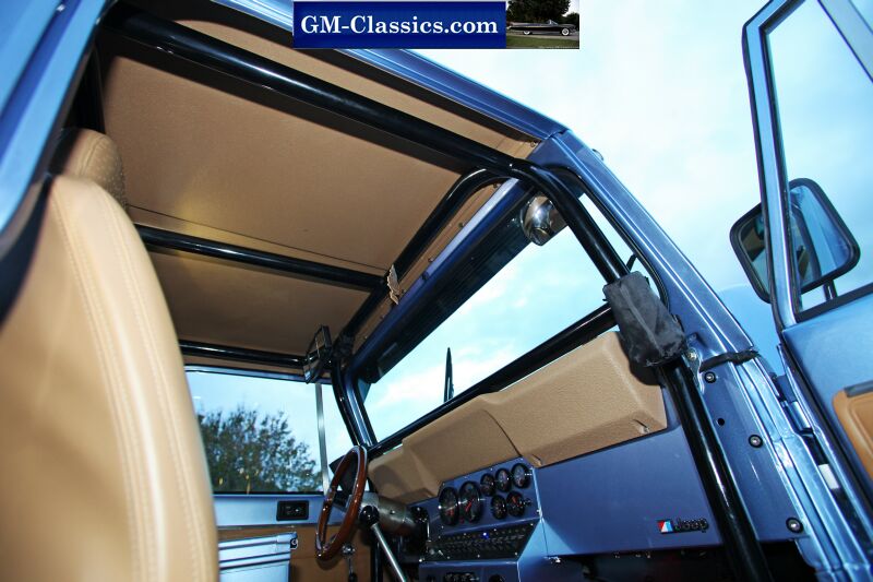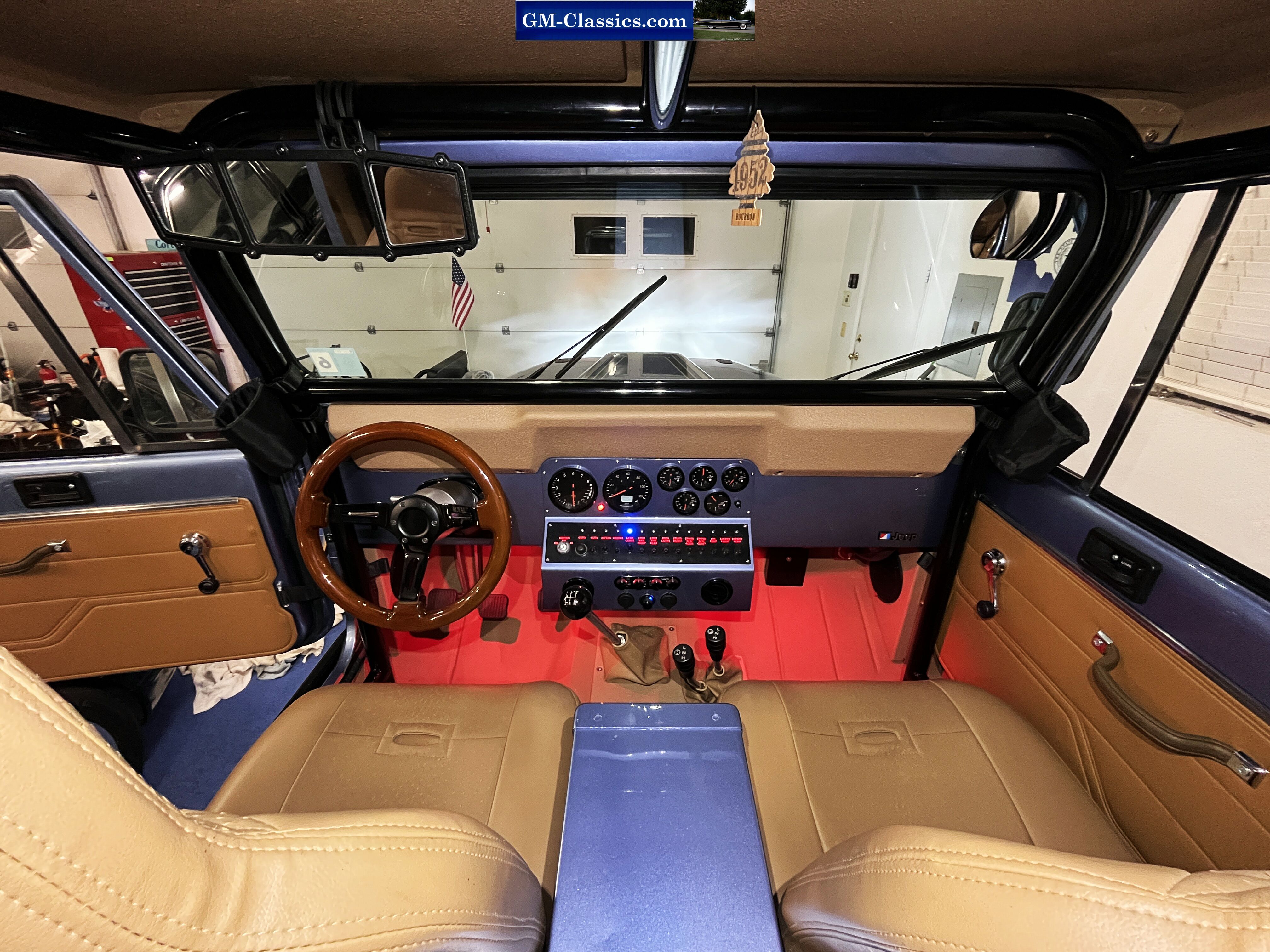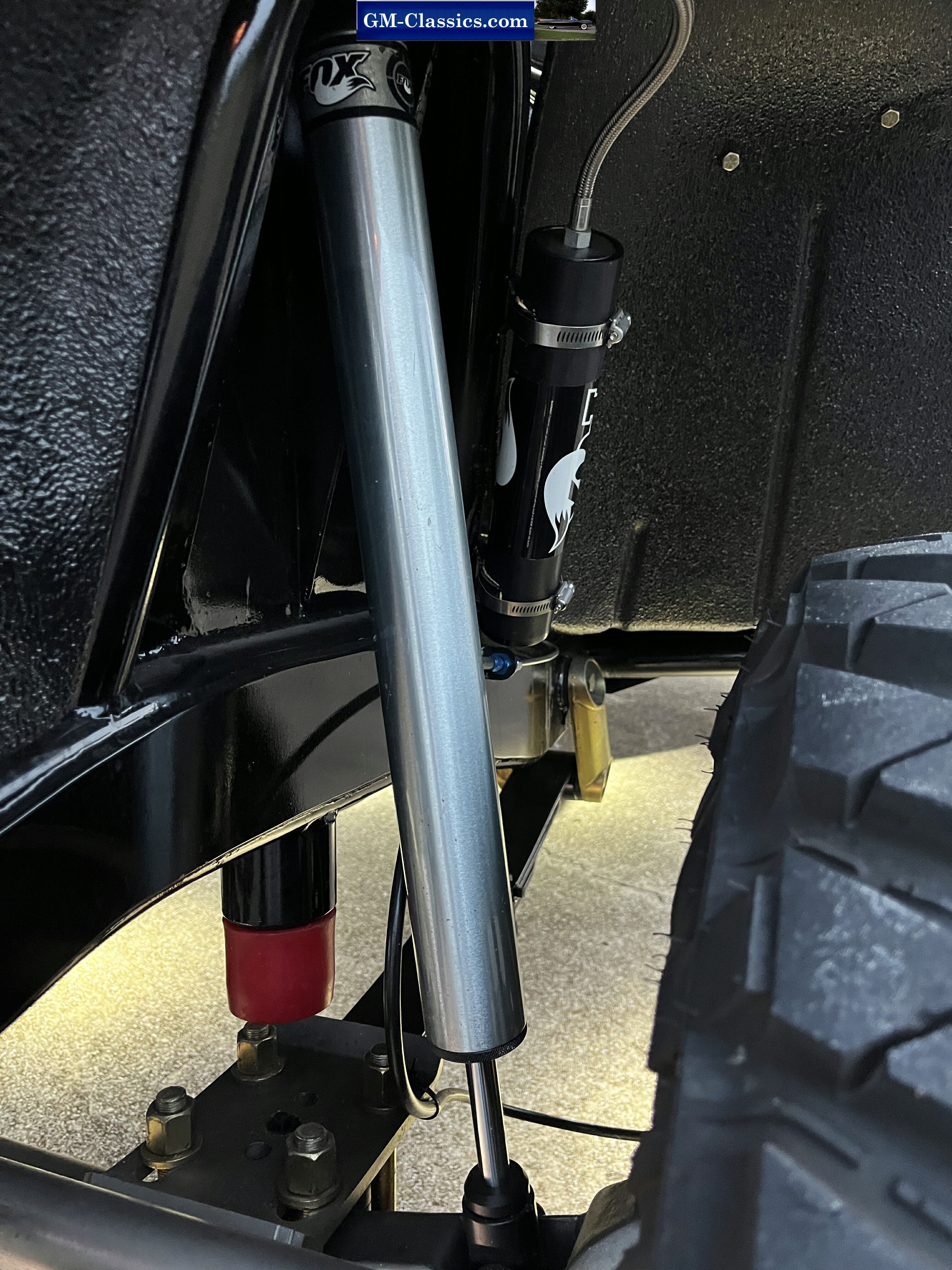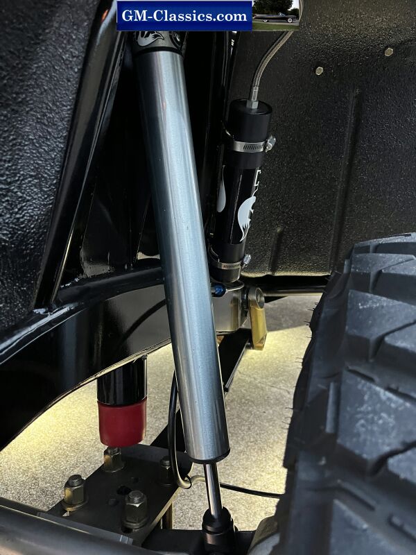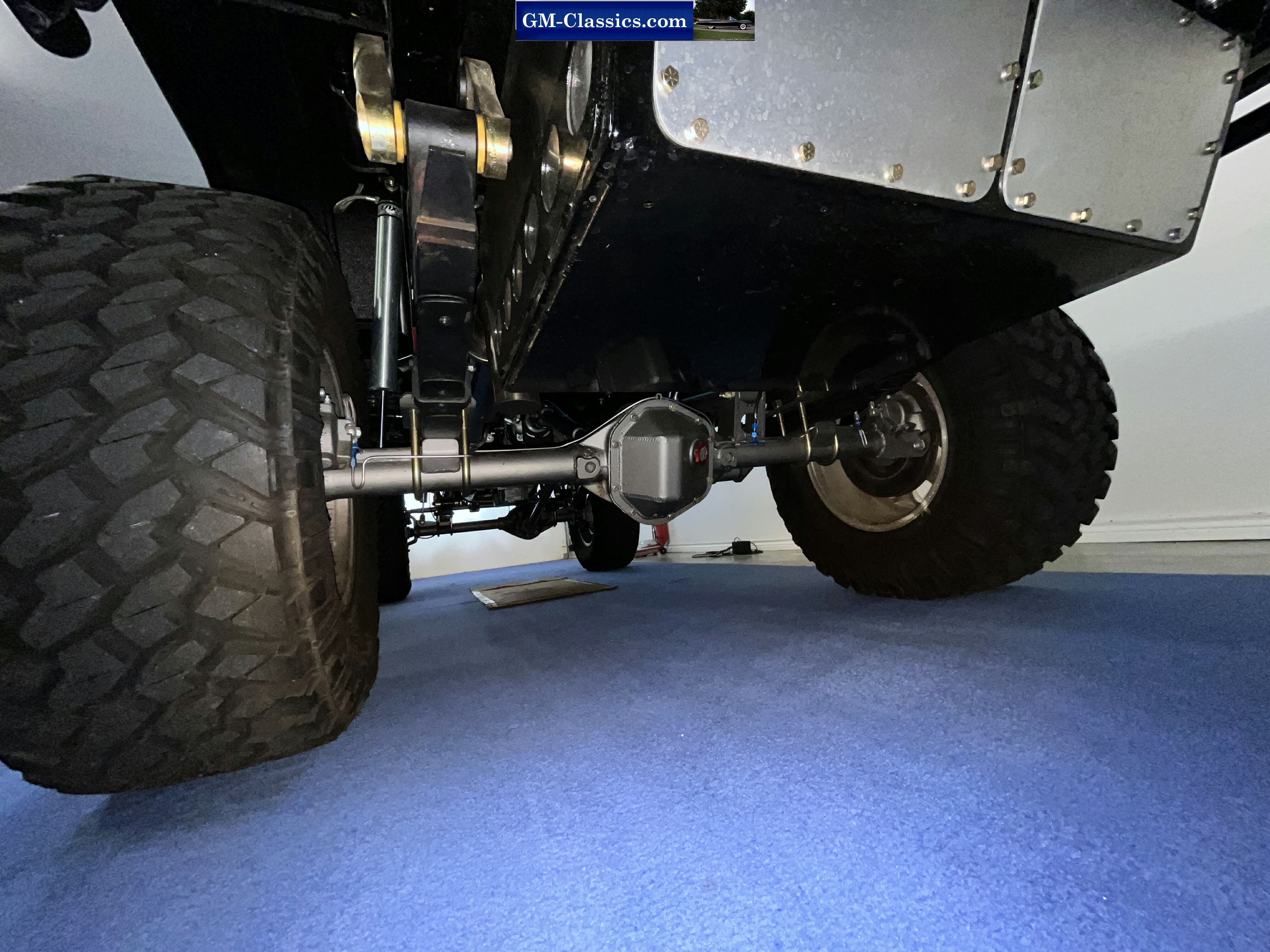 Now when you get to the interior, even the average guy who misses a lot of the frame and structural touches will see just how over the top this Jeep is. Its not a luxo barbie jeep by any means, all was done with heavy duty in mind with all color keyed Hard Line/LineX floors, this carries to the underside of the body too and key wear areas ... But it has one of the nicest custom setups with excellent working vintage air and heat as I have ever seen in any CJ.. and its weight/balance and its general mix of street/offroad suspension make it street drive excellent. In other words, you can turn a corner in this and it wont woller over on you like a crawler build, but it still can fly over dips, bumps and articulate pretty darn good. That is why I say the suspension is general use, not pure off-road. Now with the fox gas shocks you can take it one way or the other a few % too. Of course lowering air pressure is not CTIS H1 easy, but it has its onboard compressor and air tank all built in with even a dash gauge and you can re air your tires up with a hose that attaches to a quick port on it. This system also runs the air lockers.