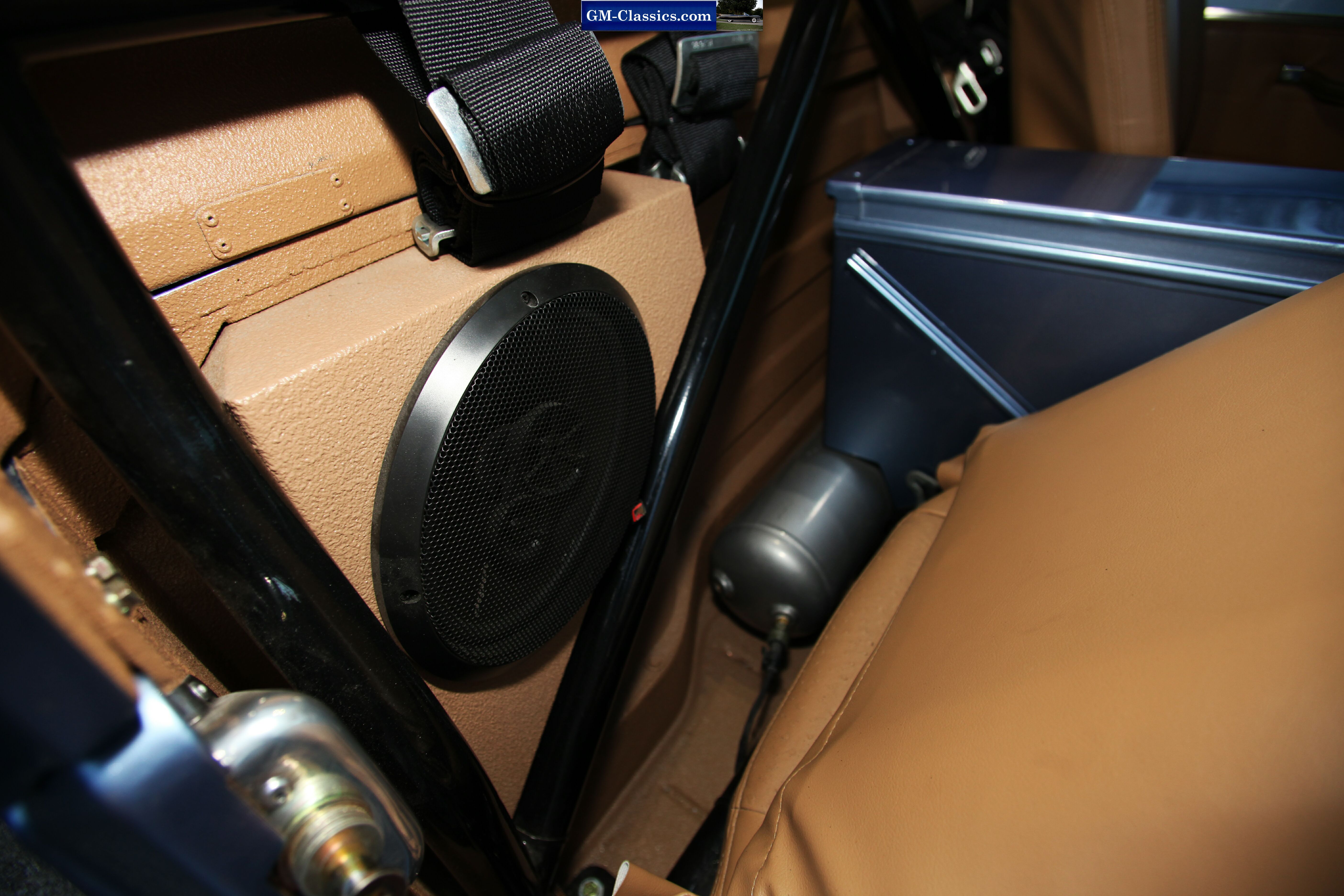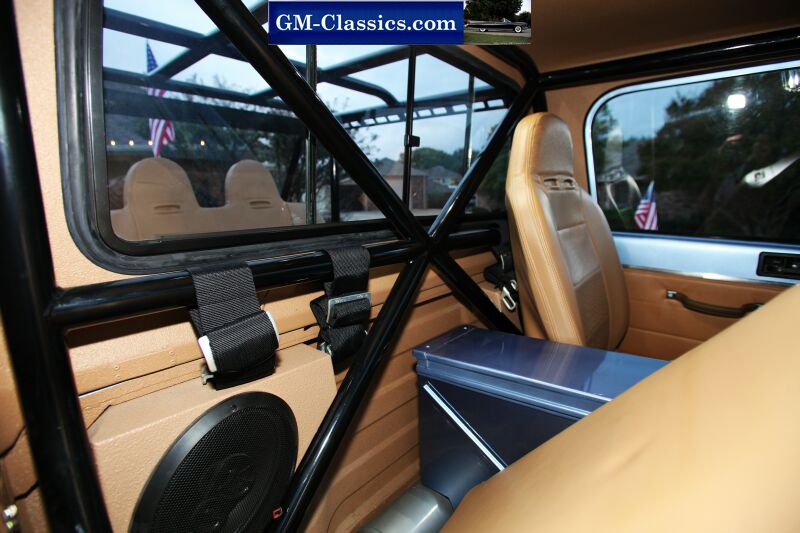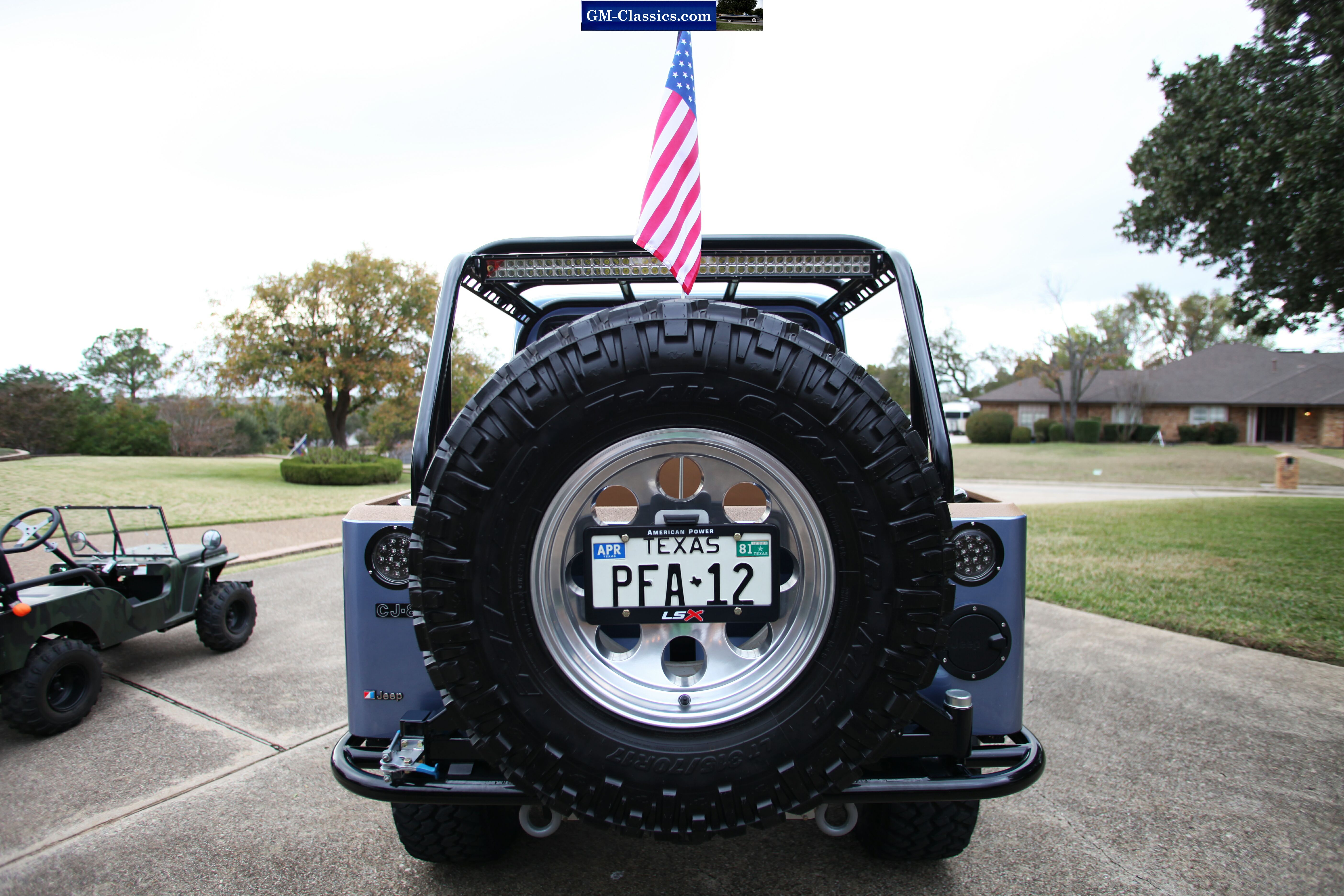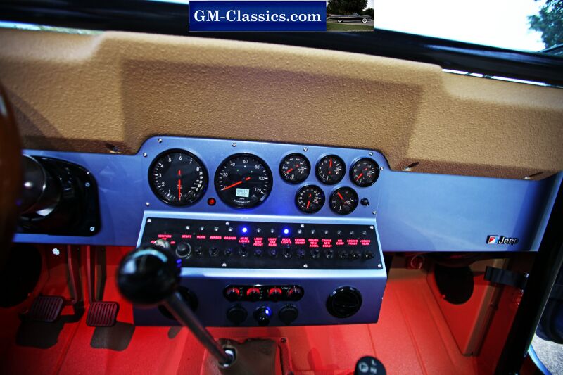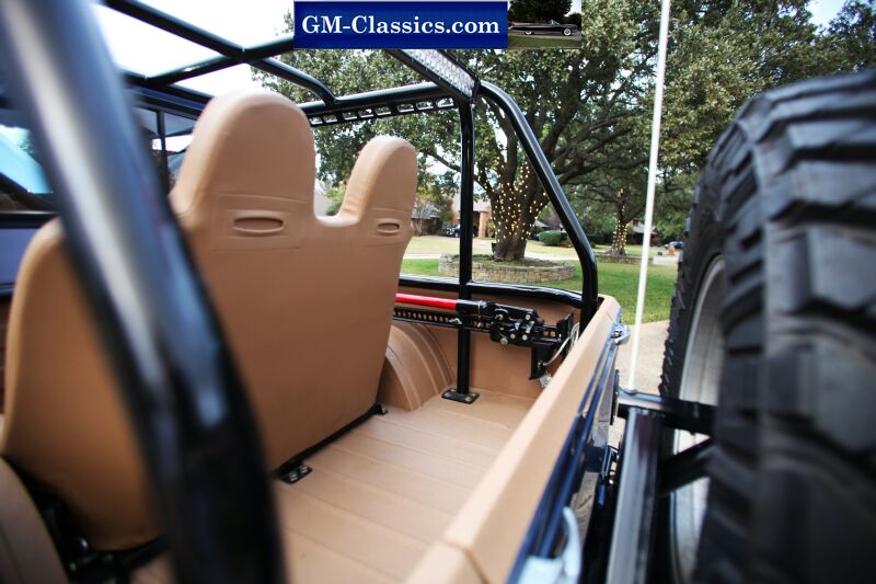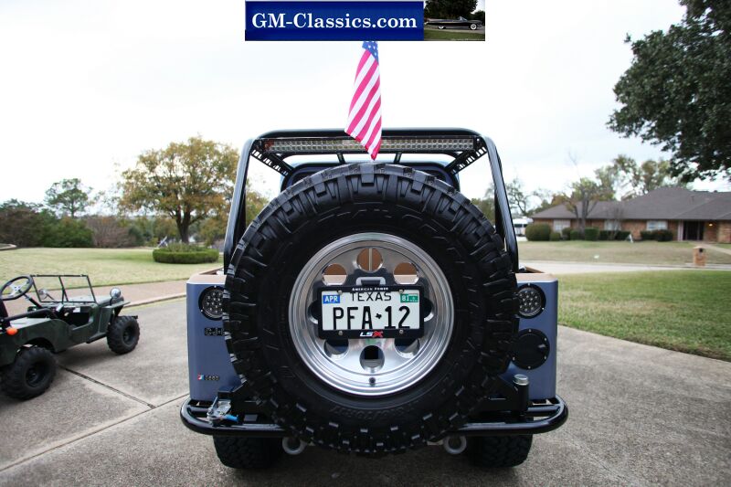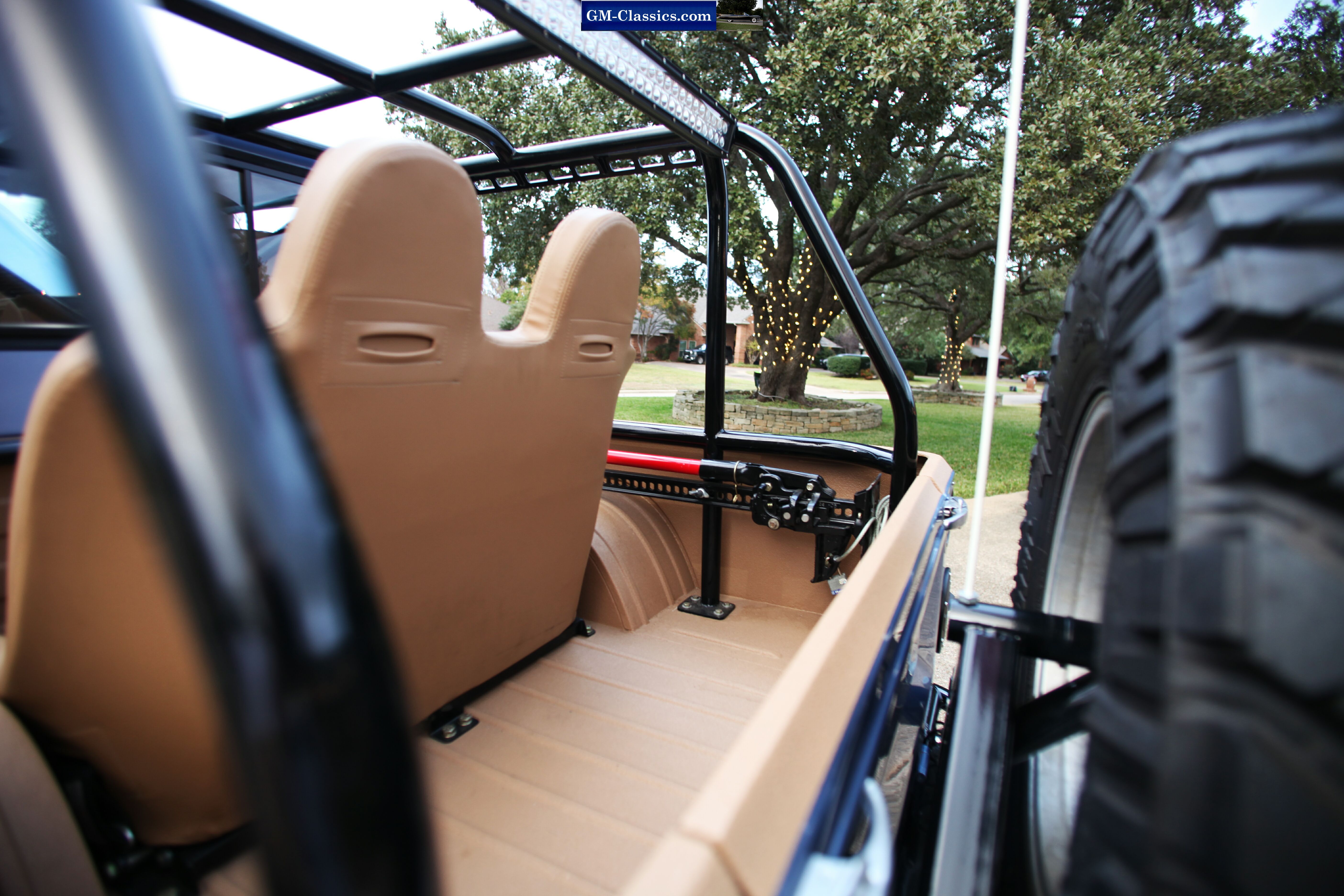 Now here is the cool part....... The engine is not a race car engine but it is still powerful, too powerful for this even. But excess is what this machine is about. It is the LM7 indestructible vortec engine with 706 heads, mild cam and all the touches needed for long term durability bought over counter as crate with ECU and wiring. It runs cool, idles like a stock chevy pickup with a mild cam AND does it all with AC on the hottest day. We use it for parades, 4th july in texas even, hard idle slow moving. Then you can put the kids in the back with the racing harness to strap them in and with the full competition built roll cage in this CJ... they are going to be as safe as in a volvo (thats a joke for you in the know)... What I am saying is this jeep is totally usable, not something that is "all show and so over go". Take it to sonic, get food, the grand kids will love it. But the grandparents must at least have the agility to climb into it. If you want to see the hidden stereo built into this thing. Watch some vids... Not what you would expect nor does it interfere with any of the near weatherproof aspect of this machine or its capabilities.