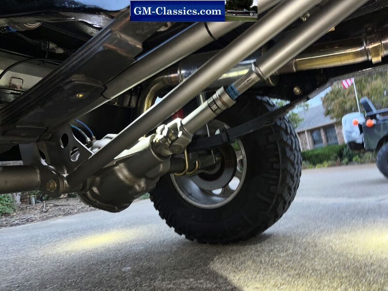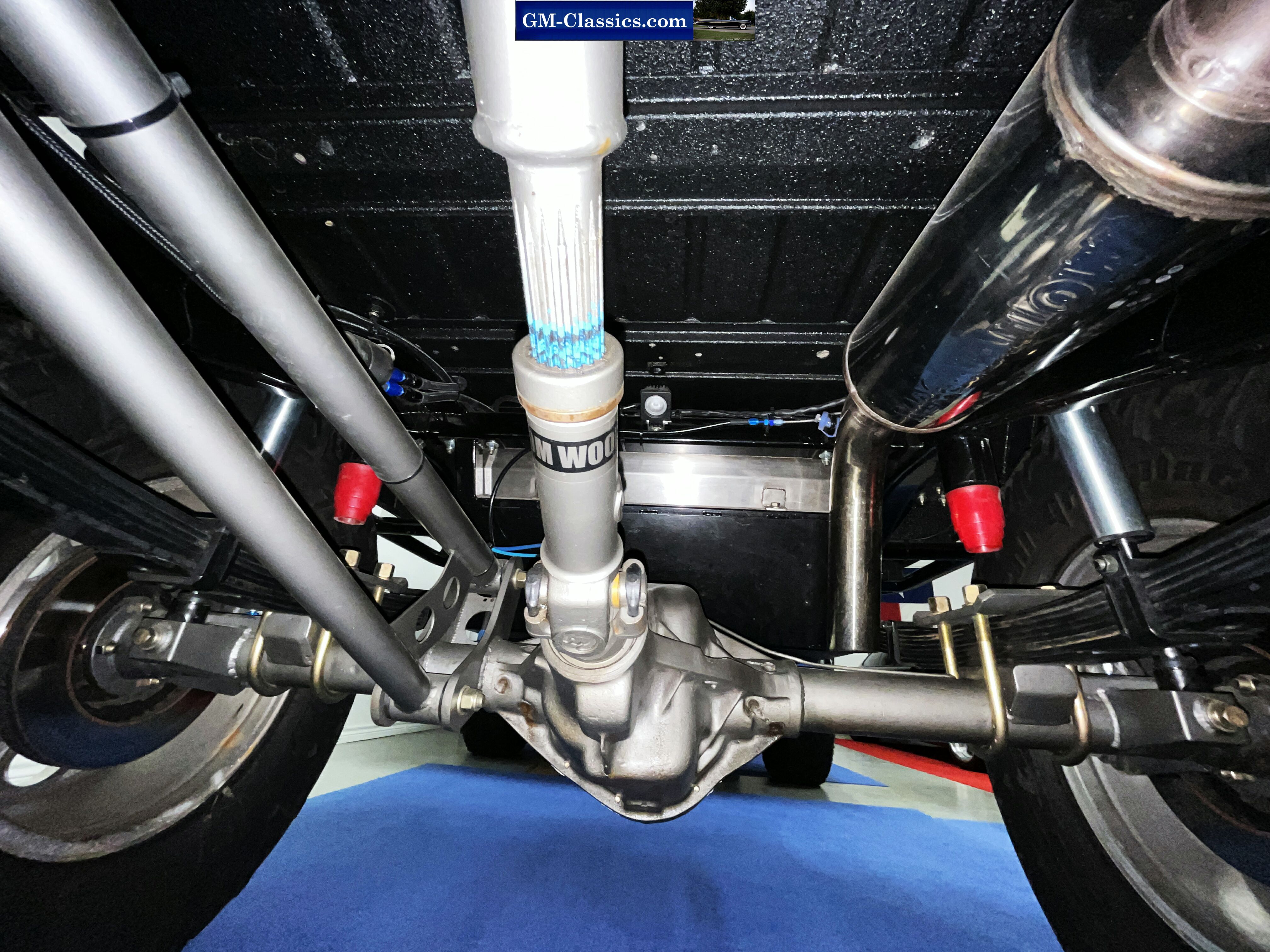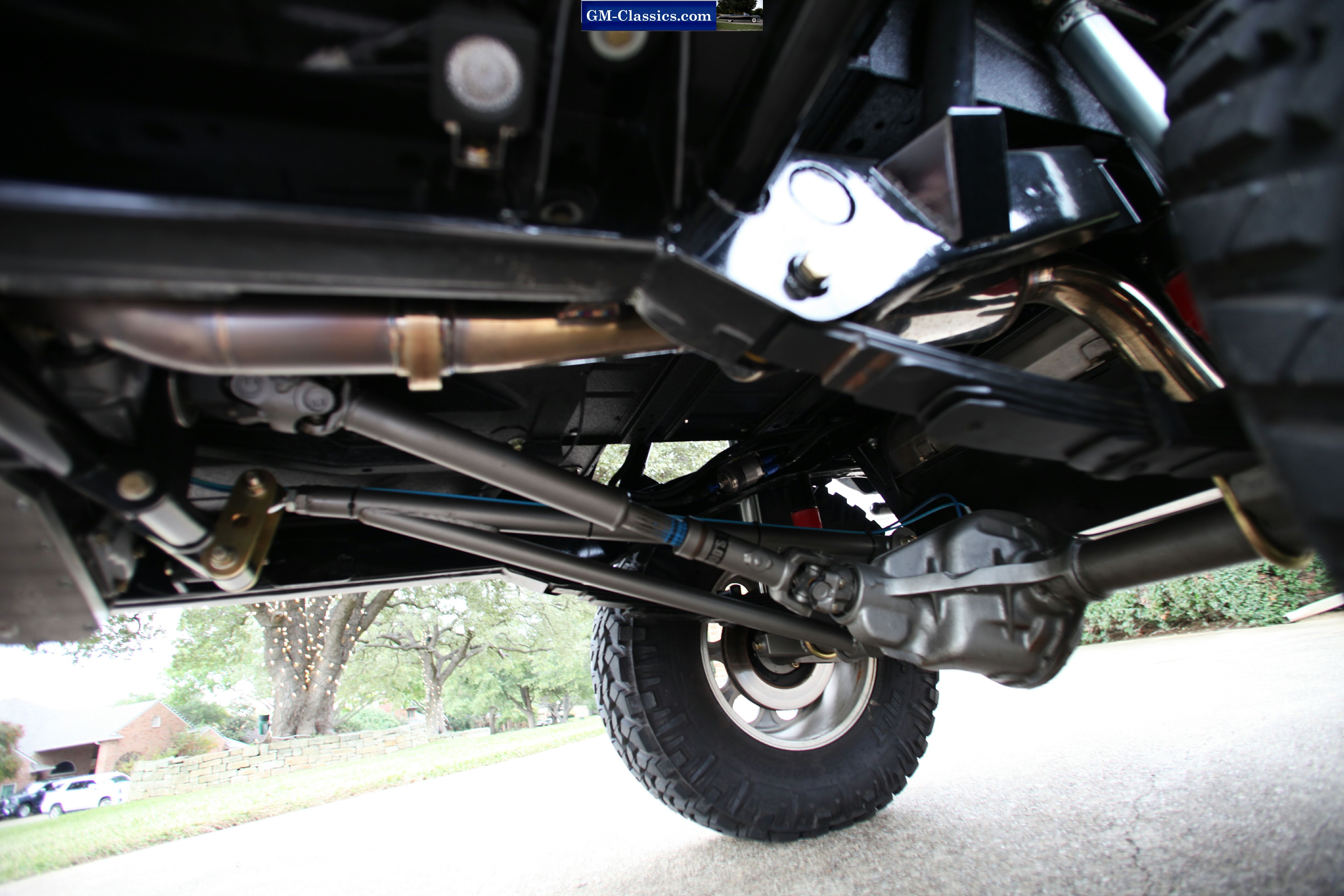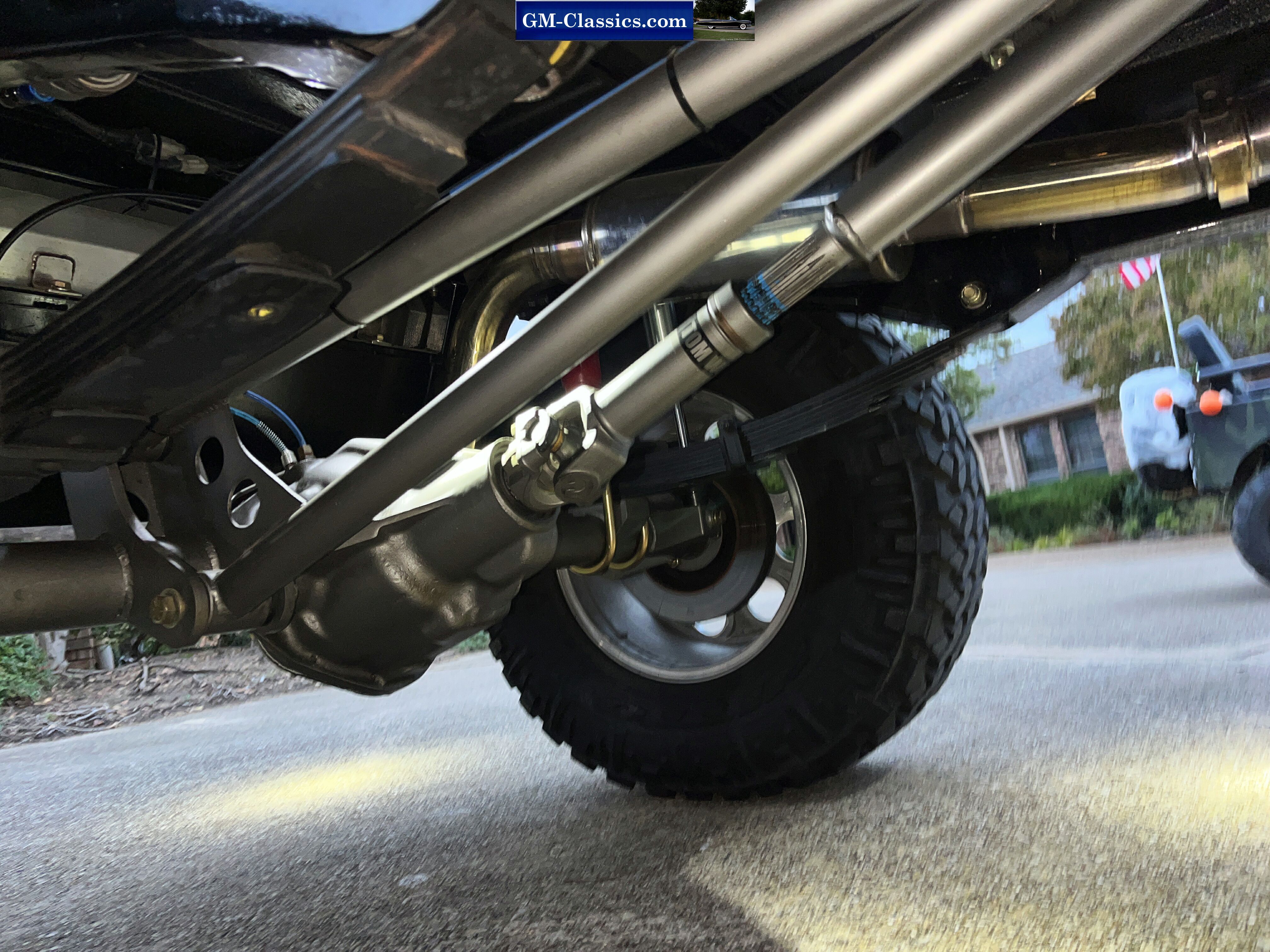 Torque arm and Tom woods driveshaft seen along with full stainless 3" exhaust, GM Z71 4 wheel disk brakes
