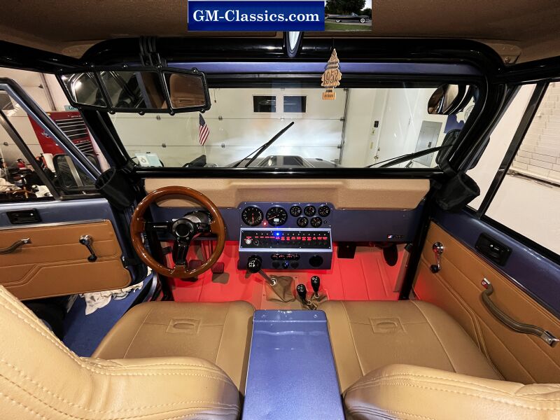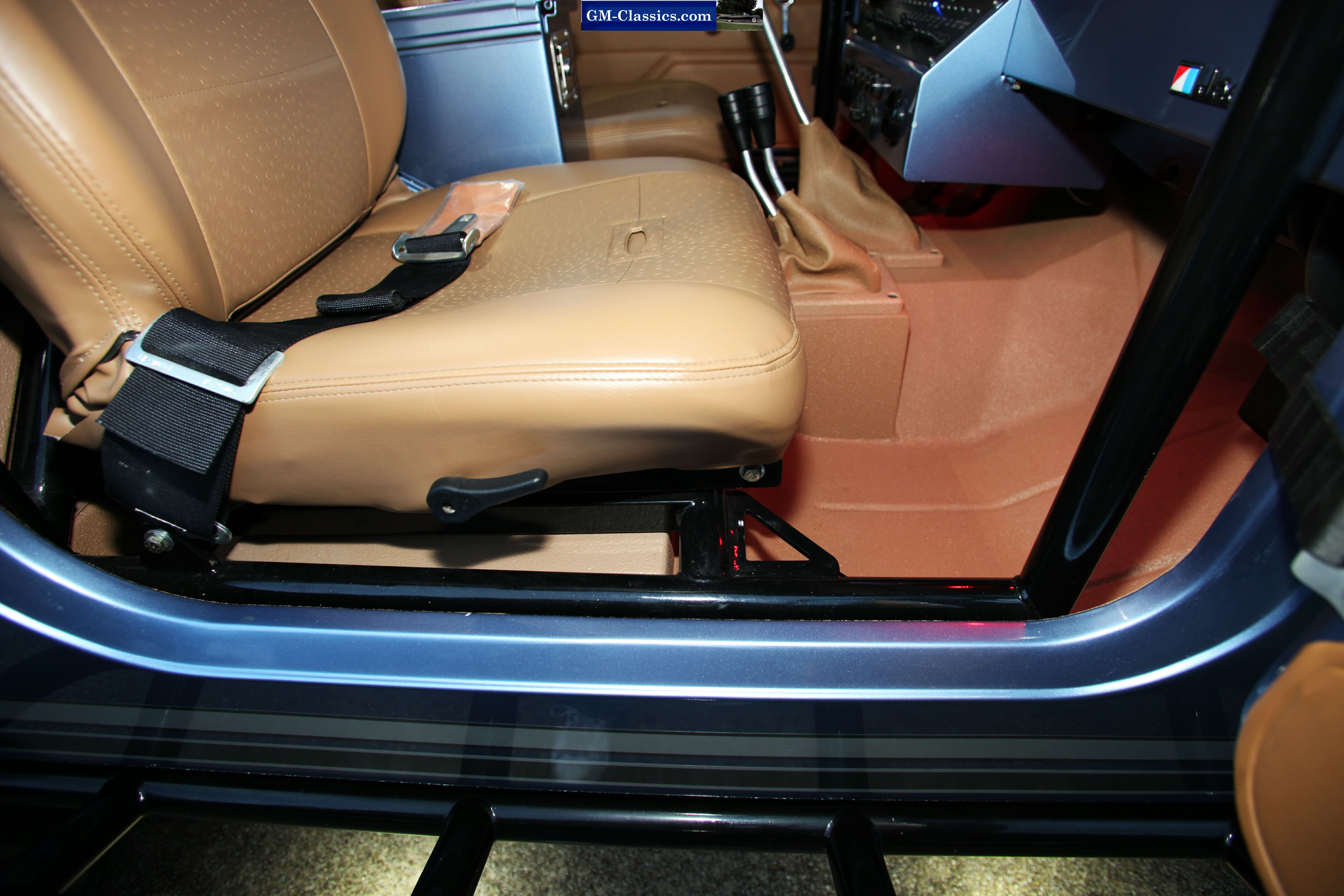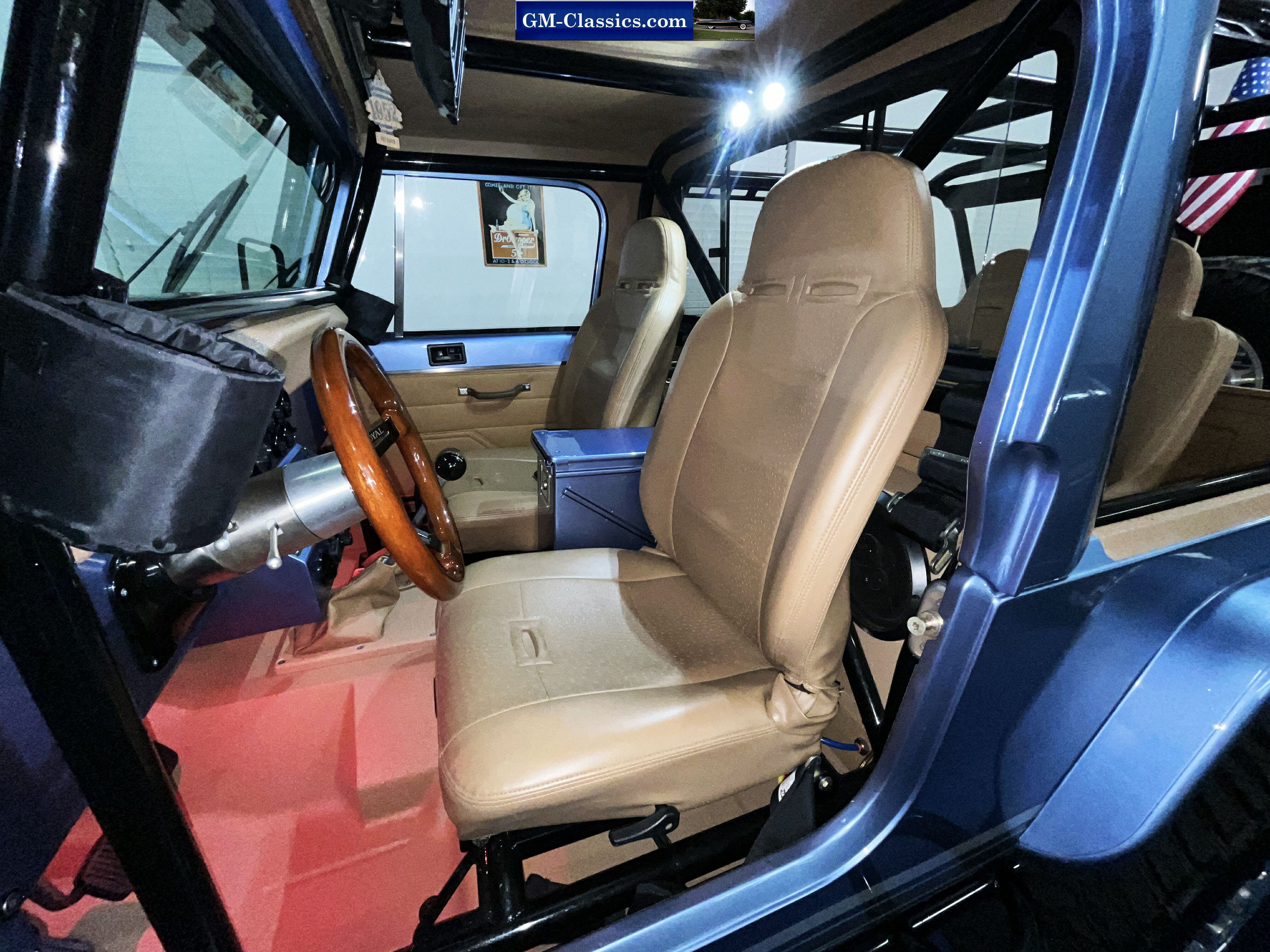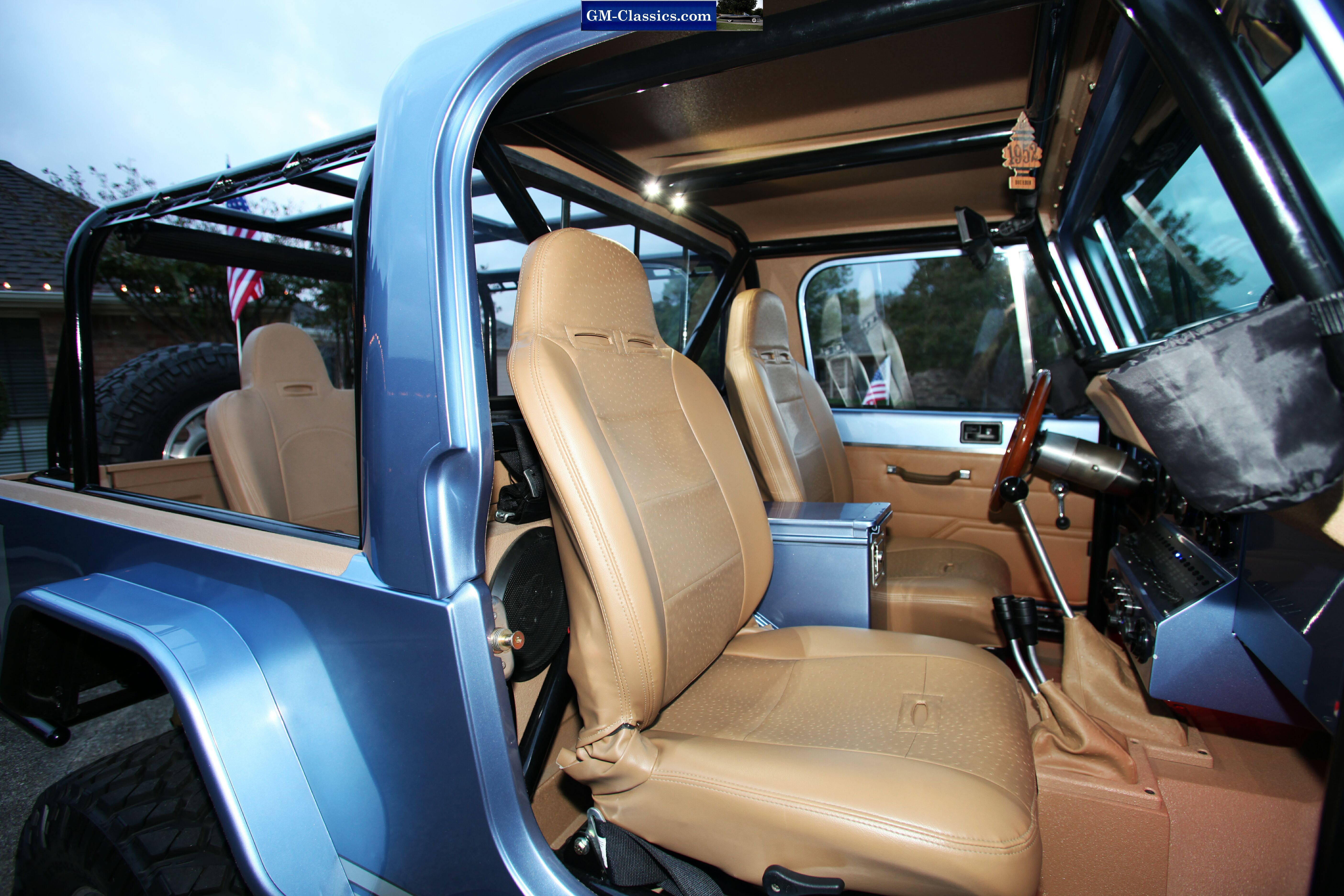 Now when you get to the interior, even the average guy who misses a lot of the frame and structural touches will see just how over the top this Jeep is. Its not a luxo barbie jeep by any means, all was done with heavy duty in mind with all color keyed Hard Line/LineX floors, this carries to the underside of the body too and key wear areas ... But it has one of the nicest custom setups with excellent working vintage air and heat as I have ever seen in any CJ.. and its weight/balance and its general mix of street/offroad suspension make it street drive excellent. In other words, you can turn a corner in this and it wont woller over on you like a crawler build, but it still can fly over dips, bumps and articulate pretty darn good. That is why I say the suspension is general use, not pure off-road. Now with the fox gas shocks you can take it one way or the other a few % too. Of course lowering air pressure is not CTIS H1 easy, but it has its onboard compressor and air tank all built in with even a dash gauge and you can re air your tires up with a hose that attaches to a quick port on it. This system also runs the air lockers.