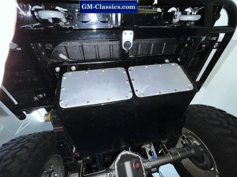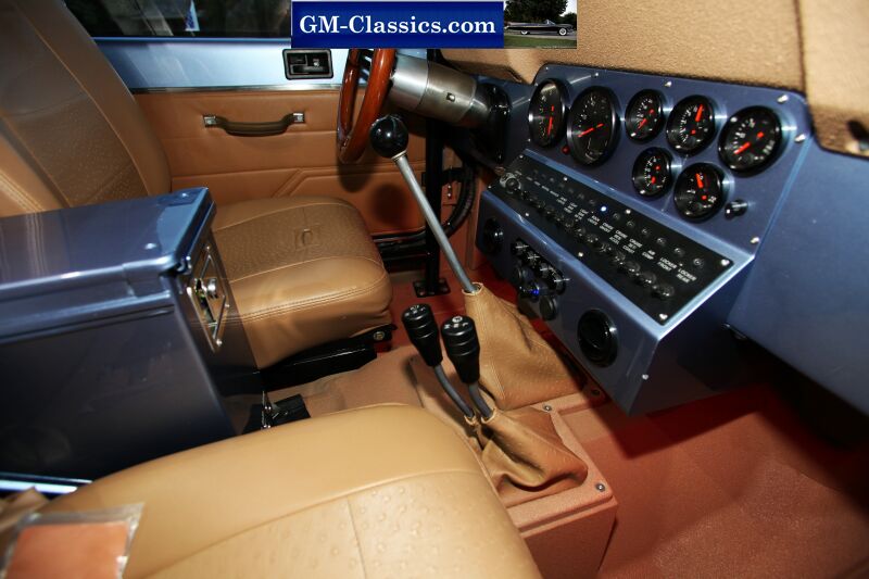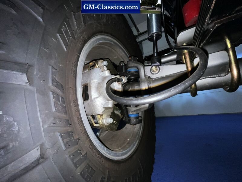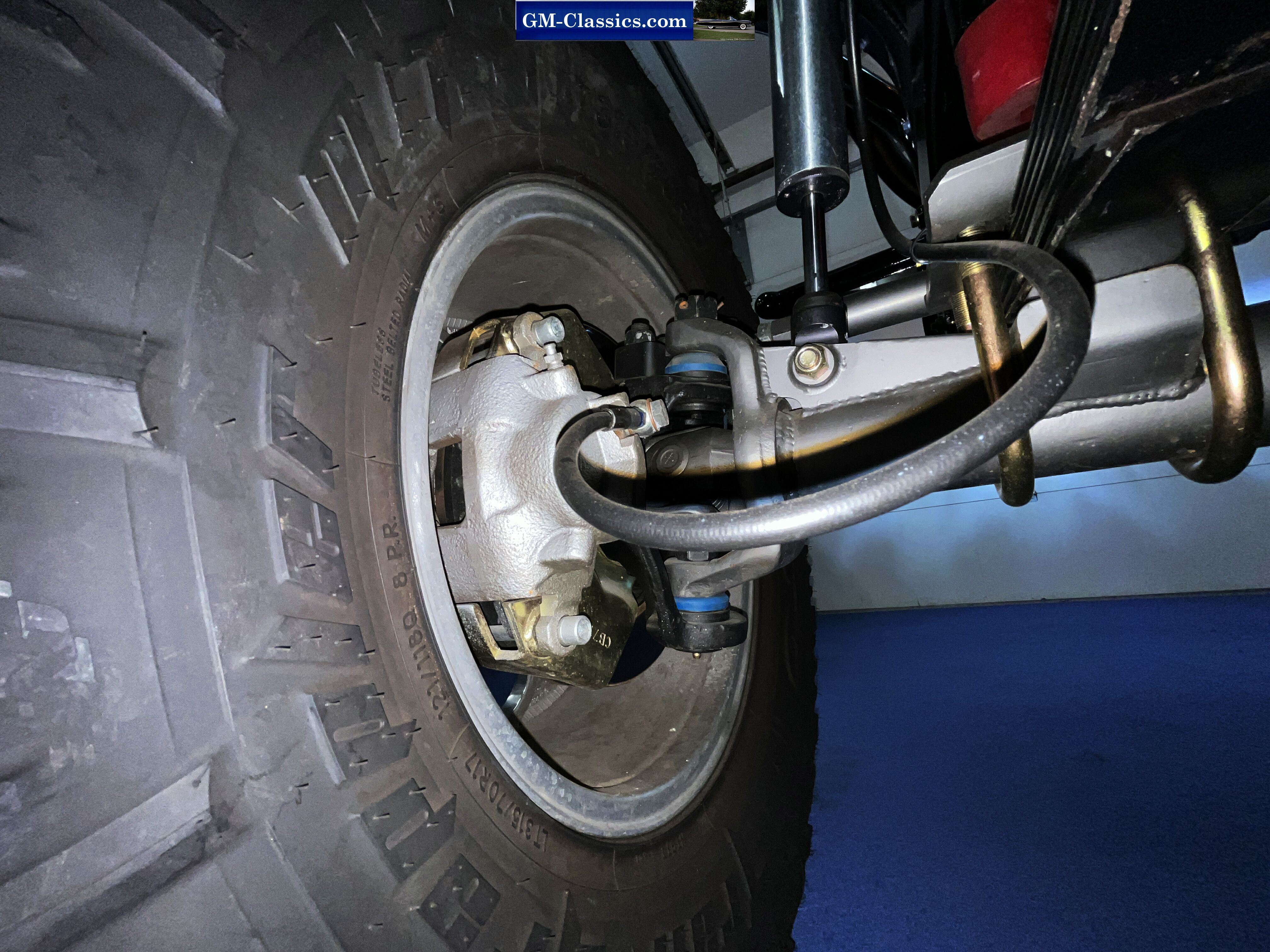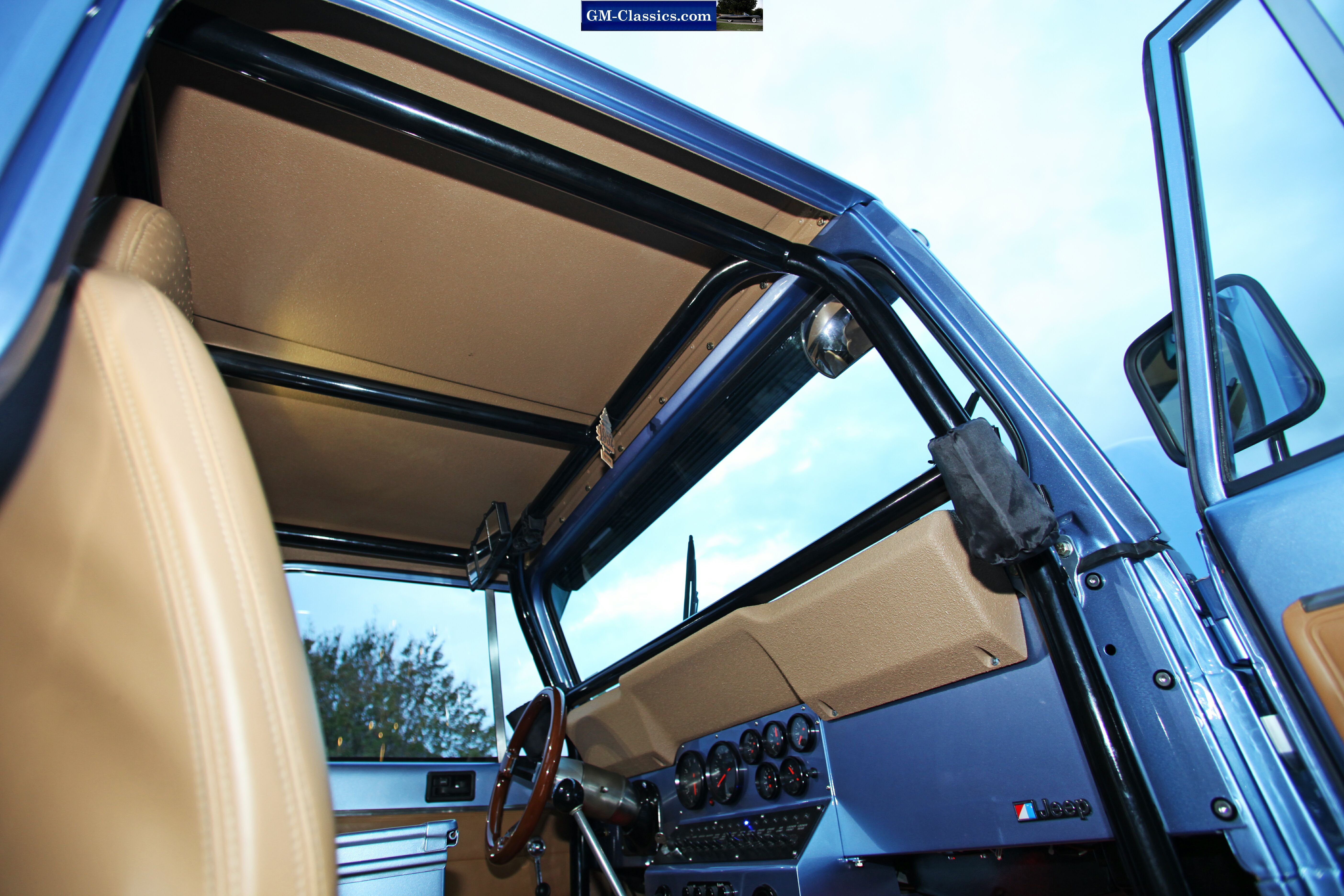 Now when you get to the interior, even the average guy who misses a lot of the frame and structural touches will see just how over the top this Jeep is. Its not a luxo barbie jeep by any means, all was done with heavy duty in mind with all color keyed Hard Line/LineX floors, this carries to the underside of the body too and key wear areas ... But it has one of the nicest custom setups with excellent working vintage air and heat as I have ever seen in any CJ.. and its weight/balance and its general mix of street/offroad suspension make it street drive excellent. In other words, you can turn a corner in this and it wont woller over on you like a crawler build, but it still can fly over dips, bumps and articulate pretty darn good. That is why I say the suspension is general use, not pure off-road. Now with the fox gas shocks you can take it one way or the other a few % too. Of course lowering air pressure is not CTIS H1 easy, but it has its onboard compressor and air tank all built in with even a dash gauge and you can re air your tires up with a hose that attaches to a quick port on it. This system also runs the air lockers.