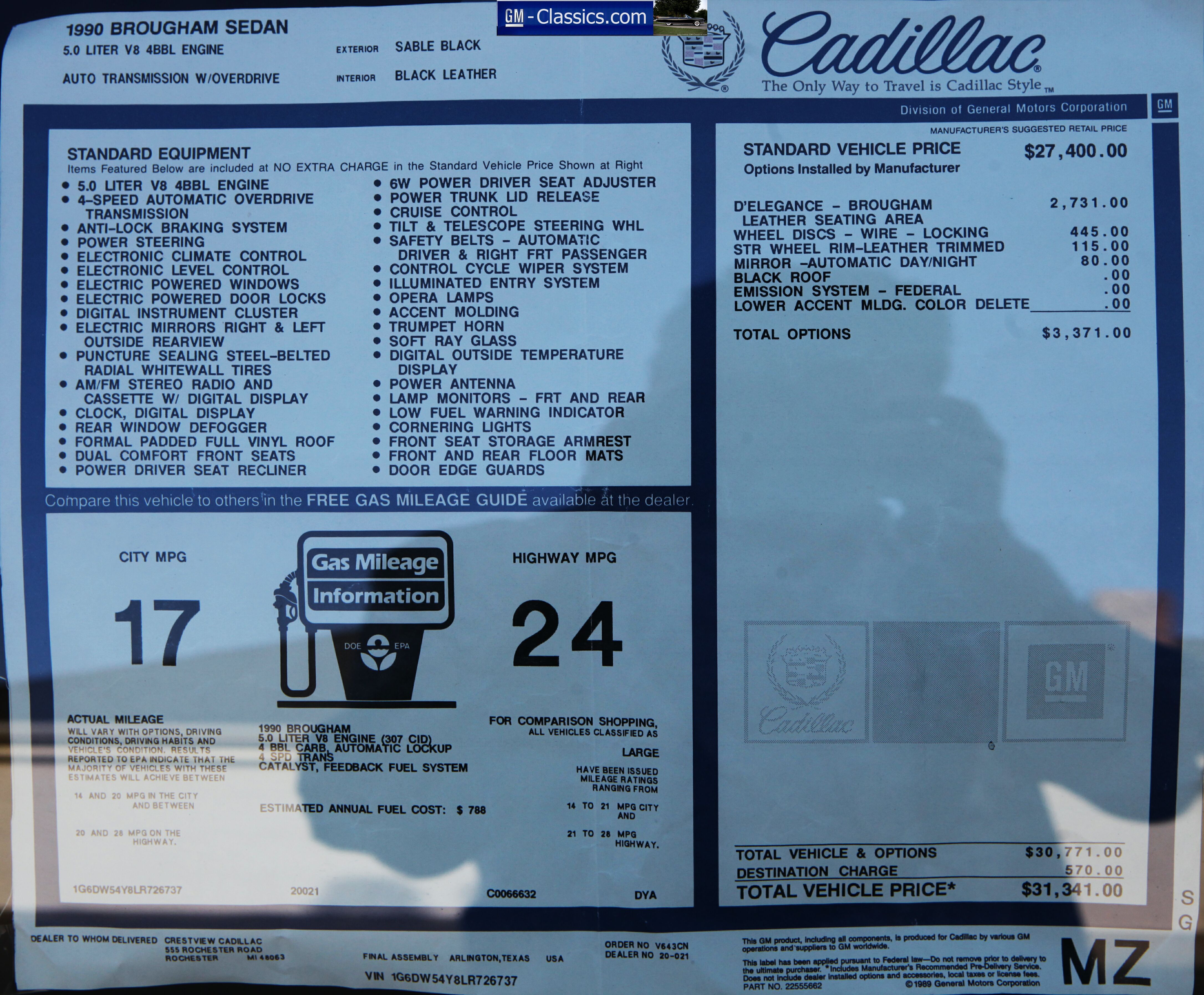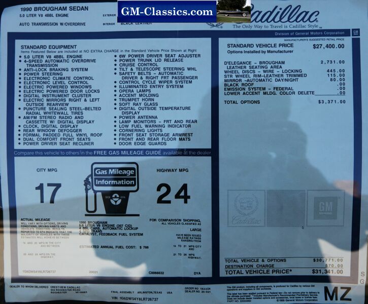 1990 Cadillac Brougham DeElegance, 399 Miles As New. Museum level, finest of the finest. Rare early 90 Brougham with the Olds 4BBL engine. These cars were only built for less than a month before the Chevy 5.0 engine became the platform standard. This has proven to be the better engine as its an Oldsmobile. Loaded DeElegance with optional wire wheel. This car was purchased new and put away by an Automotive Executive with GM.